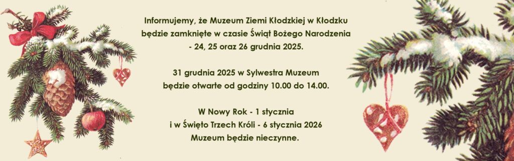 - Ważna wiadomośćInformujemy, że Muzeum Ziemi Kłodzkiej w Kłodzku będzie zamknięte w czasie Świąt Bożego Narodzenia – 24, 25 oraz 26 grudnia 2025. 31 grudnia 2025 w Sylwestra Muzeum będzie otwarte od… Dowiedz się więcej »Ważna wiadomość