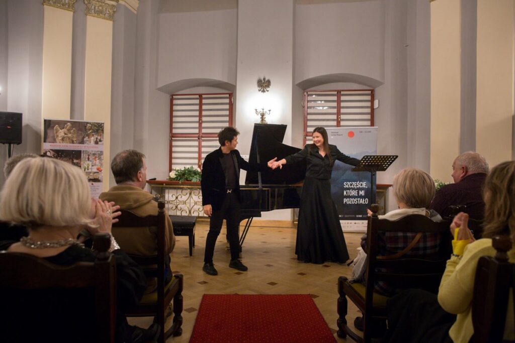 Klasę pianisty (i fortepianu, niedawnego Jubilata) uzupełniła w kolejnej części koncertu magia głosu i słowa. Oto do Congyou Wanga dołączyła Magdalena Kulig, żeby zaprezentować publiczności urokliwe wykonanie pieśni. Najpierw były to pieśni Chopina: Piosnka litewska, Smutna rzeka oraz Moja pieszczotka, które zabrzmiały z ciekawymi przesłaniami tekstów, a do tego z różnorodnymi, elegancko rozdawanymi publiczności emocjami. Całość tak została zaprezentowana, że słuchający, po koncercie, pytali, czy duet Kulig-Wang będzie częściej współpracował? Oby tak się stało.
