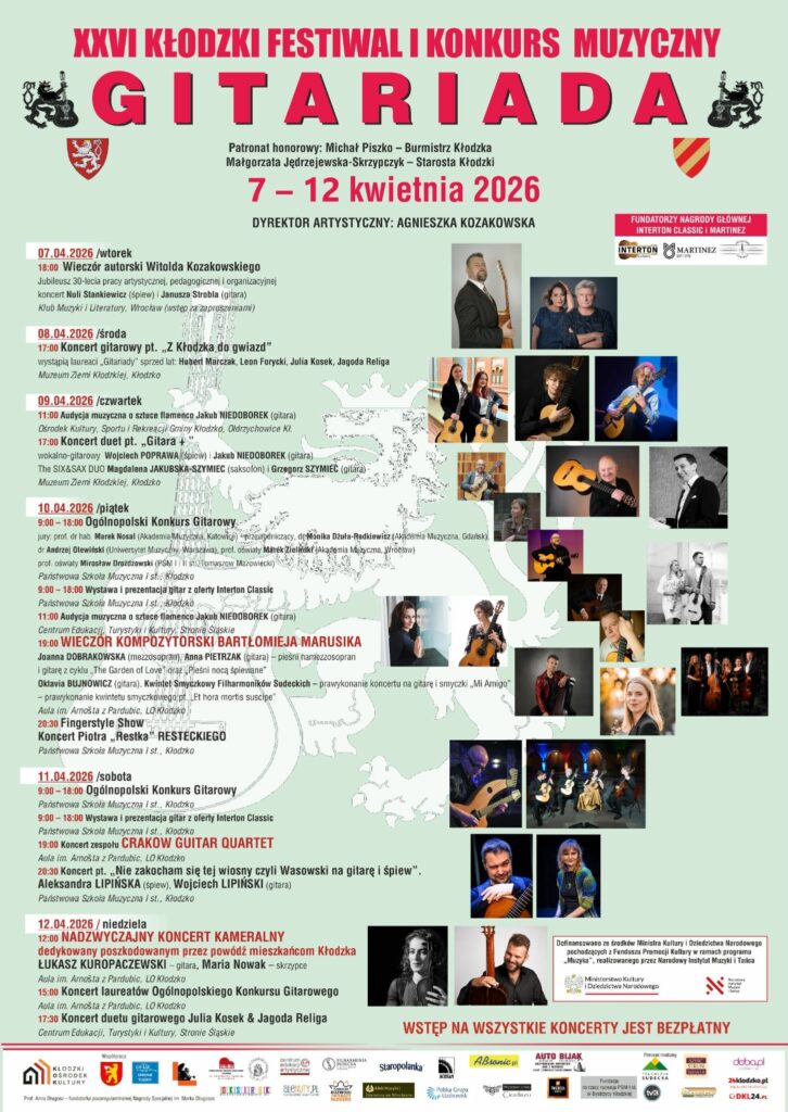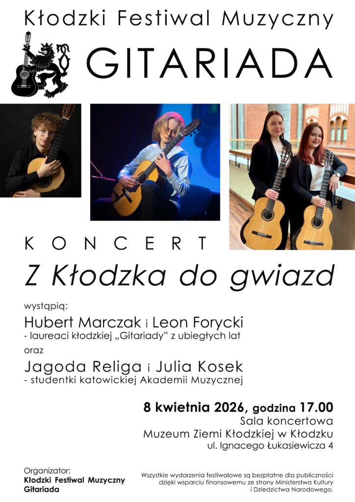 W dniu 8 kwietnia 2026 r. o godz. 17.00 w sali koncertowej Muzeum Ziemi Kłodzkiej odbędzie się festiwalowy koncert pt. „Z Kłodzka do gwiazd”, na którym usłyszeć będzie można laureatów kłodzkiej „Gitariady” ubiegłych lat – Huberta Marczaka, Leona Foryckiego oraz obecne studentki katowickiej Akademii Muzycznej: Jagodę Religę iJulię Kosek, które – jako uczennice – wielokrotnie zdobywały laury na konkursie w Kłodzku.