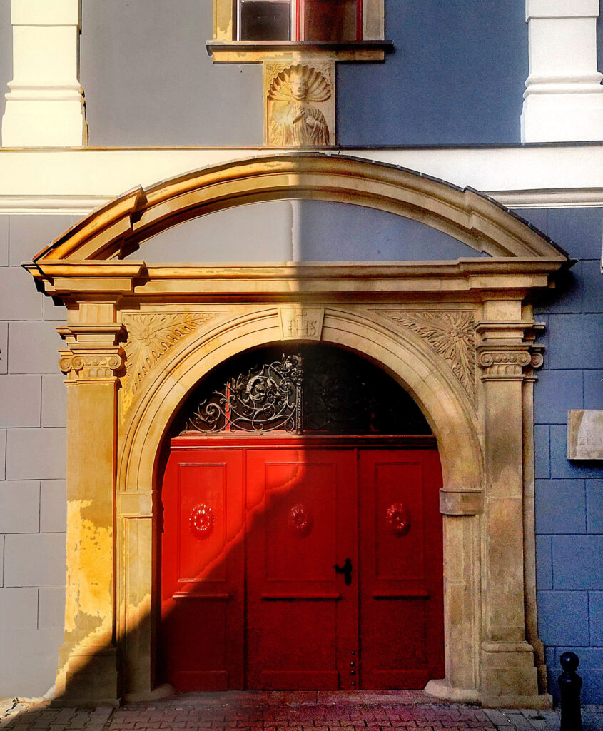 Drzwi wejściowe okala portal, składający się z zamkniętego łukiem naczółka, podpartego dwoma podwojonymi pilastrami, nad którym znajduje się niewielka nisza z rzeźbą św. Alojzego Gonzagi, patrona konwiktu.