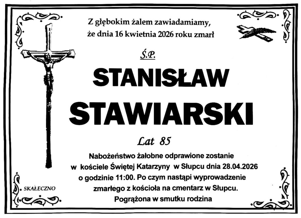 Stanisław Stawiarski zmarł, po długiej chorobie 16 kwietnia 2026 r. Nabożeństwo żałobne odprawione zostanie 28 kwietnia 2026 r. o godzinie 11.00 w kościele parafialnym św. Katarzyny w Nowej Rudzie-Słupcu, gdzie pożegnamy Artystę.