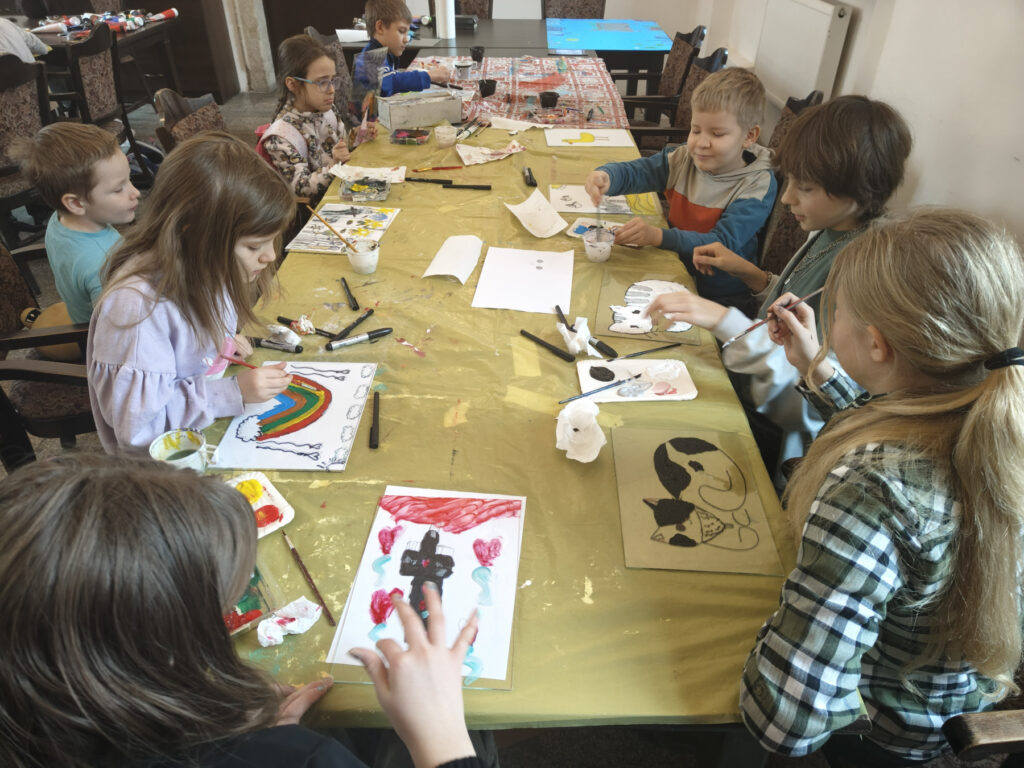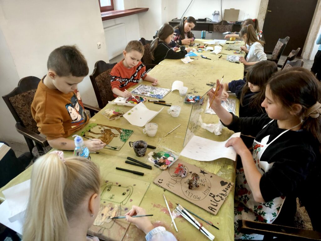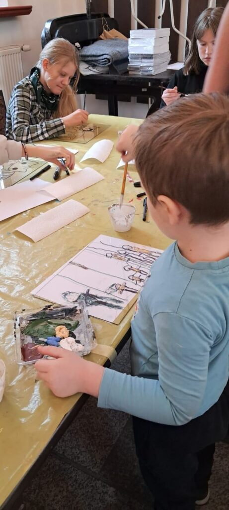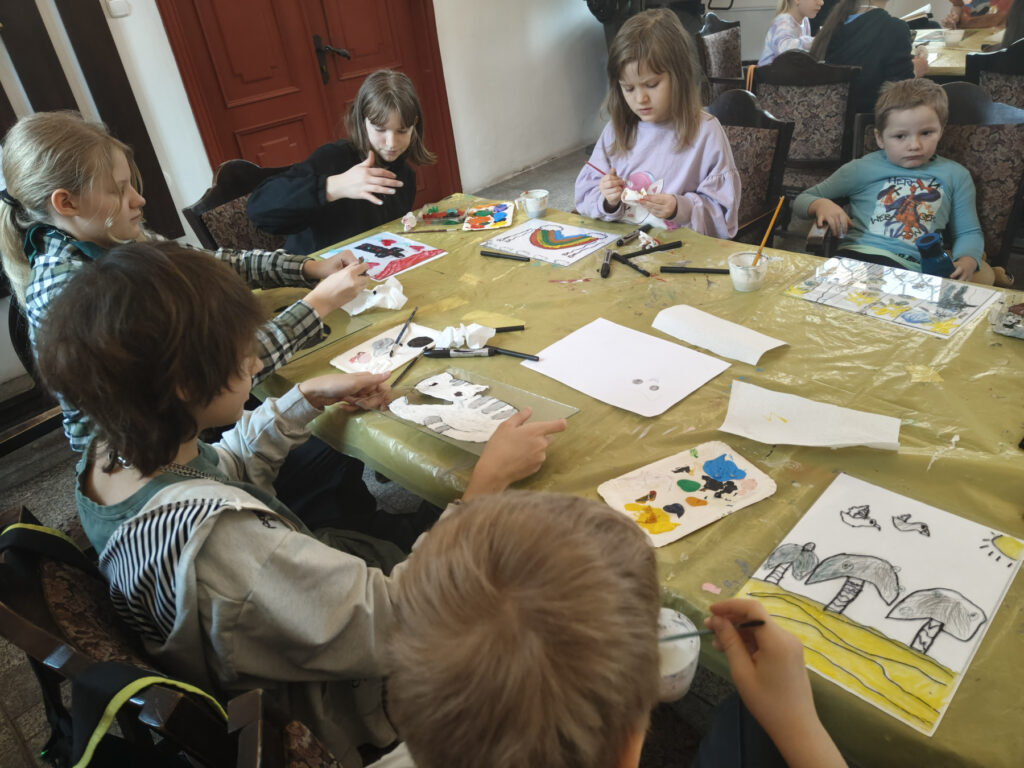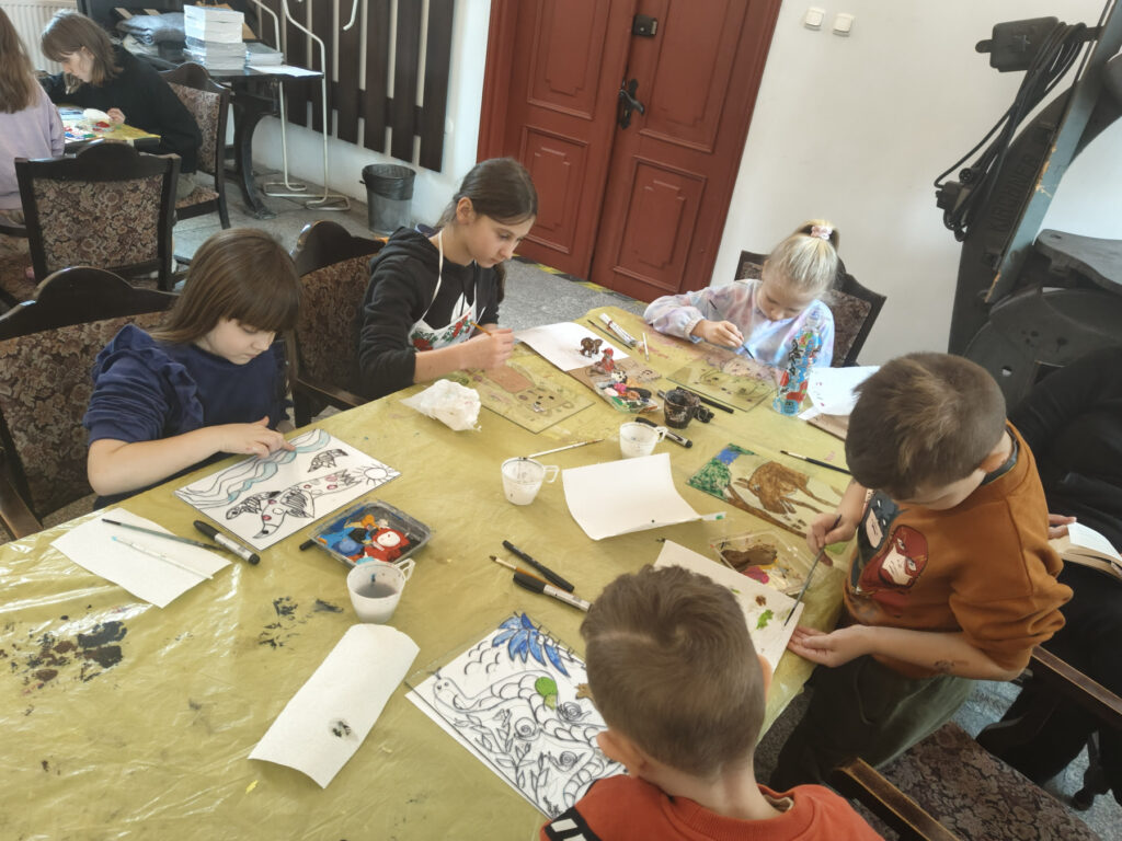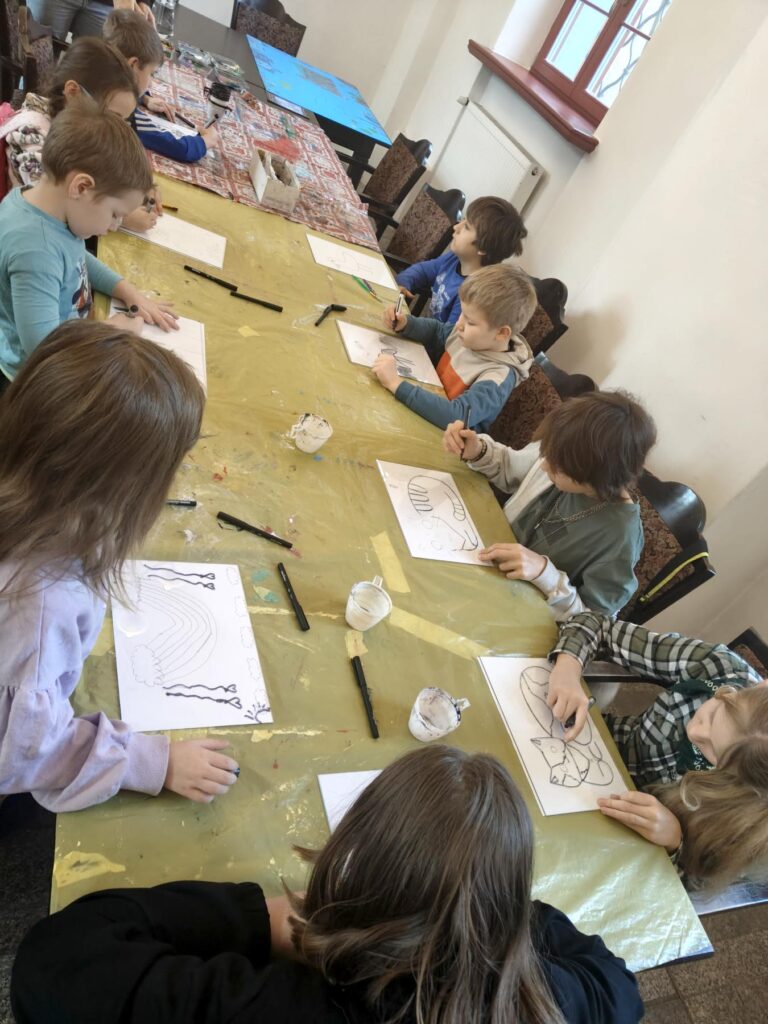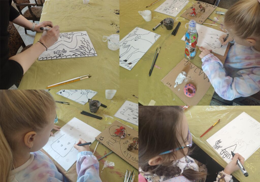 Uczestnicy zajęć poznali twórczość krakowskiego artysty Krzysztofa Okonia na wystawie „Ptaki Niebieskie” i wykonali szkice inspirowane widzianymi obrazami. Następnie zeszliśmy do sali warsztatowej, gdzie, za pomocą pisaków i cienkopisów, dzieci przenosiły na szklaną taflę swoje rysunki, tak jak robił to Artysta. Później, używając farb akrylowych, wypełniały prace wybranymi kolorami.