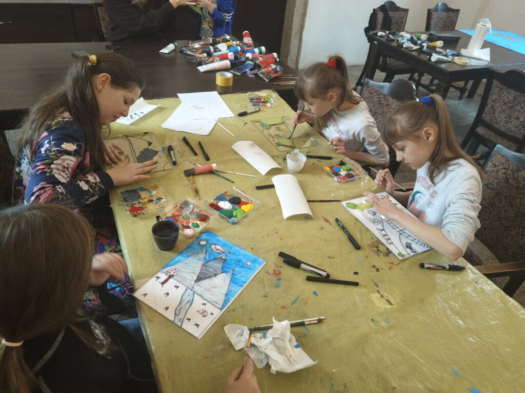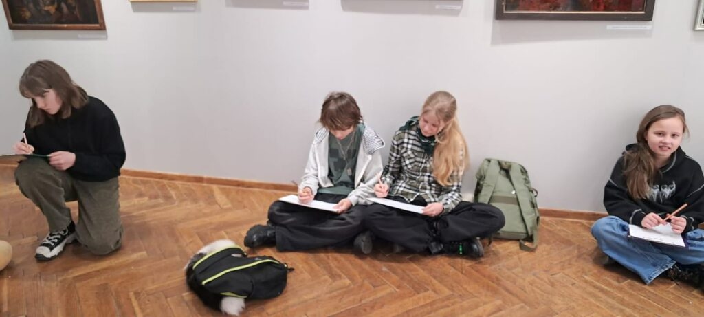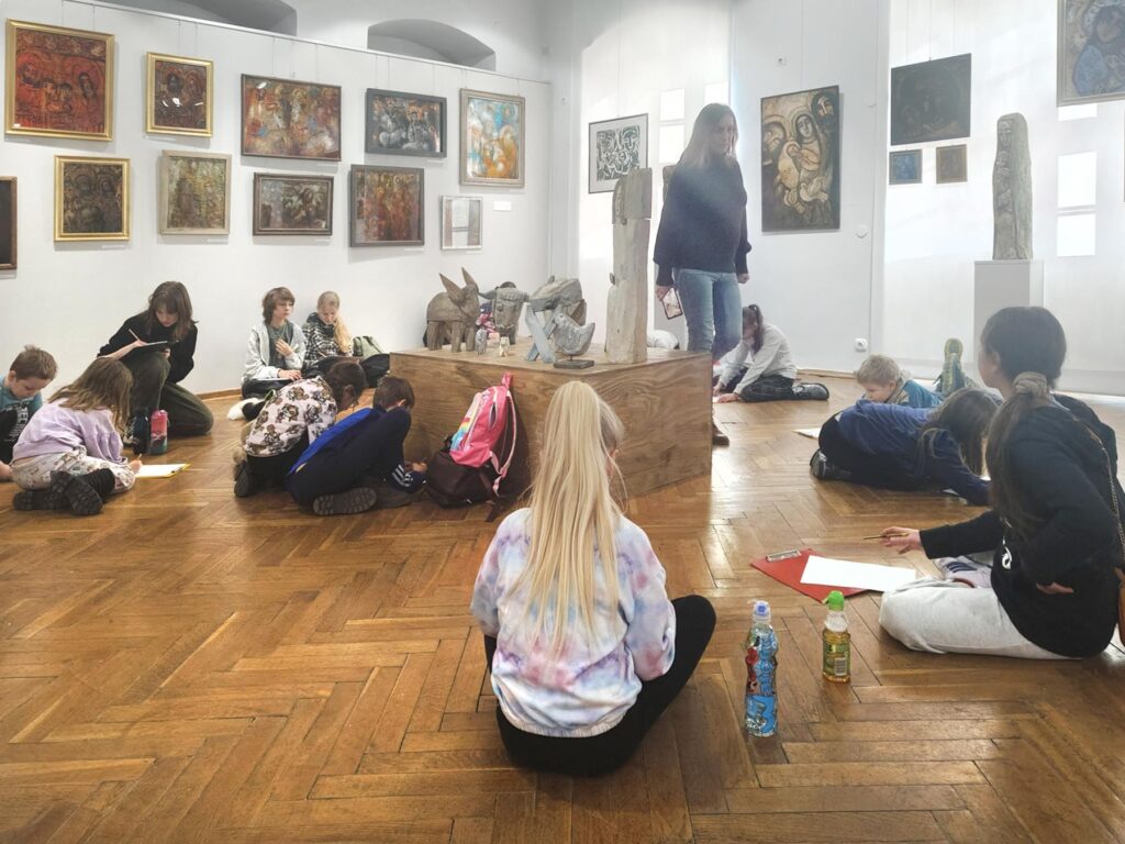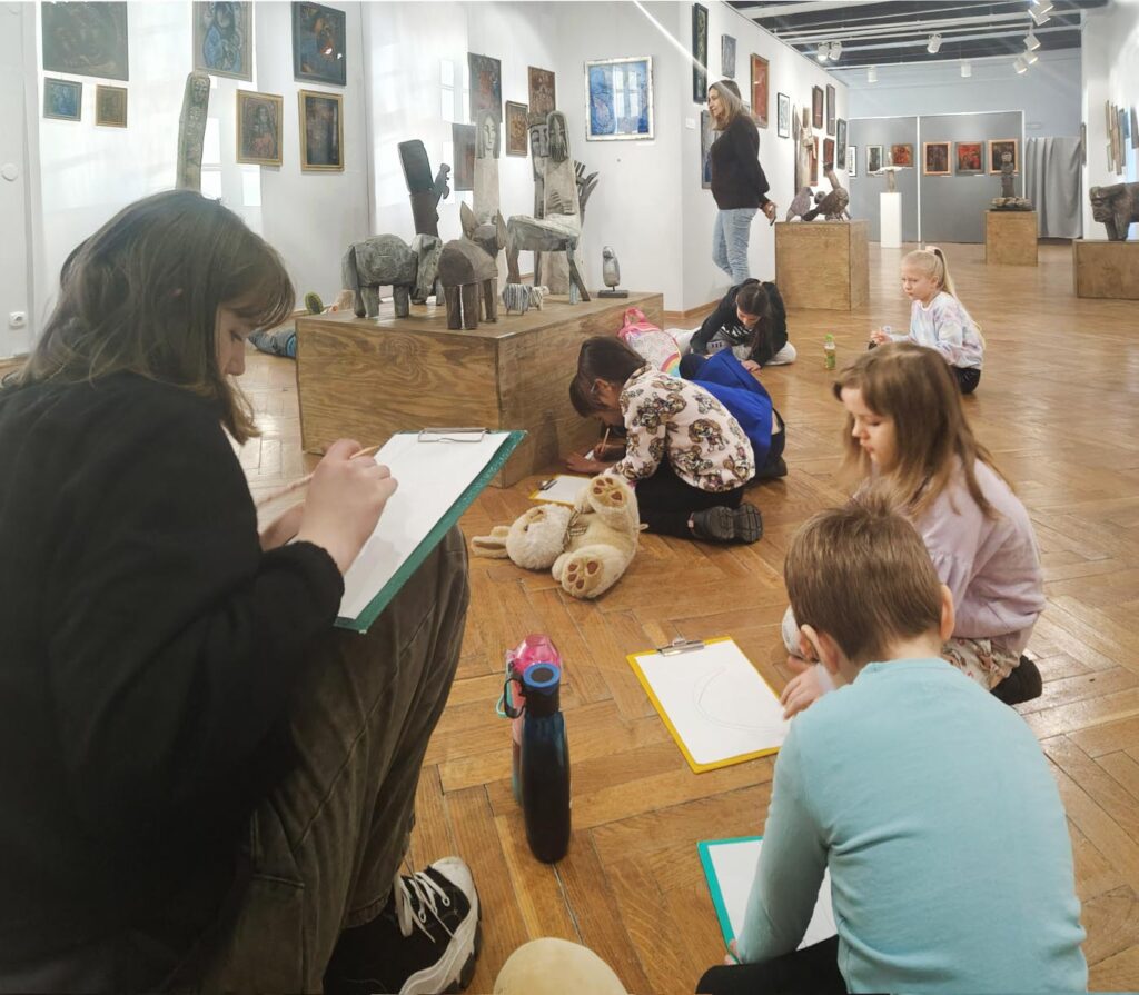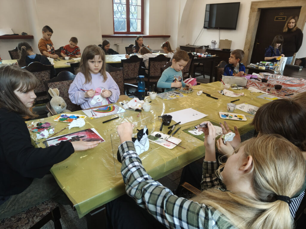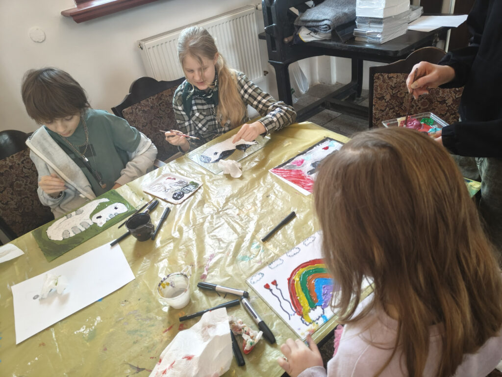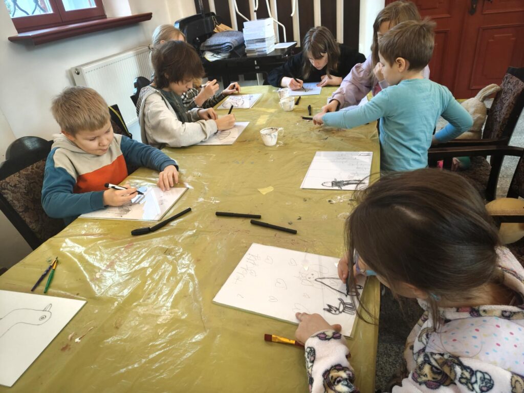 Uczestnicy zajęć poznali twórczość krakowskiego artysty Krzysztofa Okonia na wystawie „Ptaki Niebieskie” i wykonali szkice inspirowane widzianymi obrazami. Następnie zeszliśmy do sali warsztatowej, gdzie, za pomocą pisaków i cienkopisów, dzieci przenosiły na szklaną taflę swoje rysunki, tak jak robił to Artysta. Później, używając farb akrylowych, wypełniały prace wybranymi kolorami.