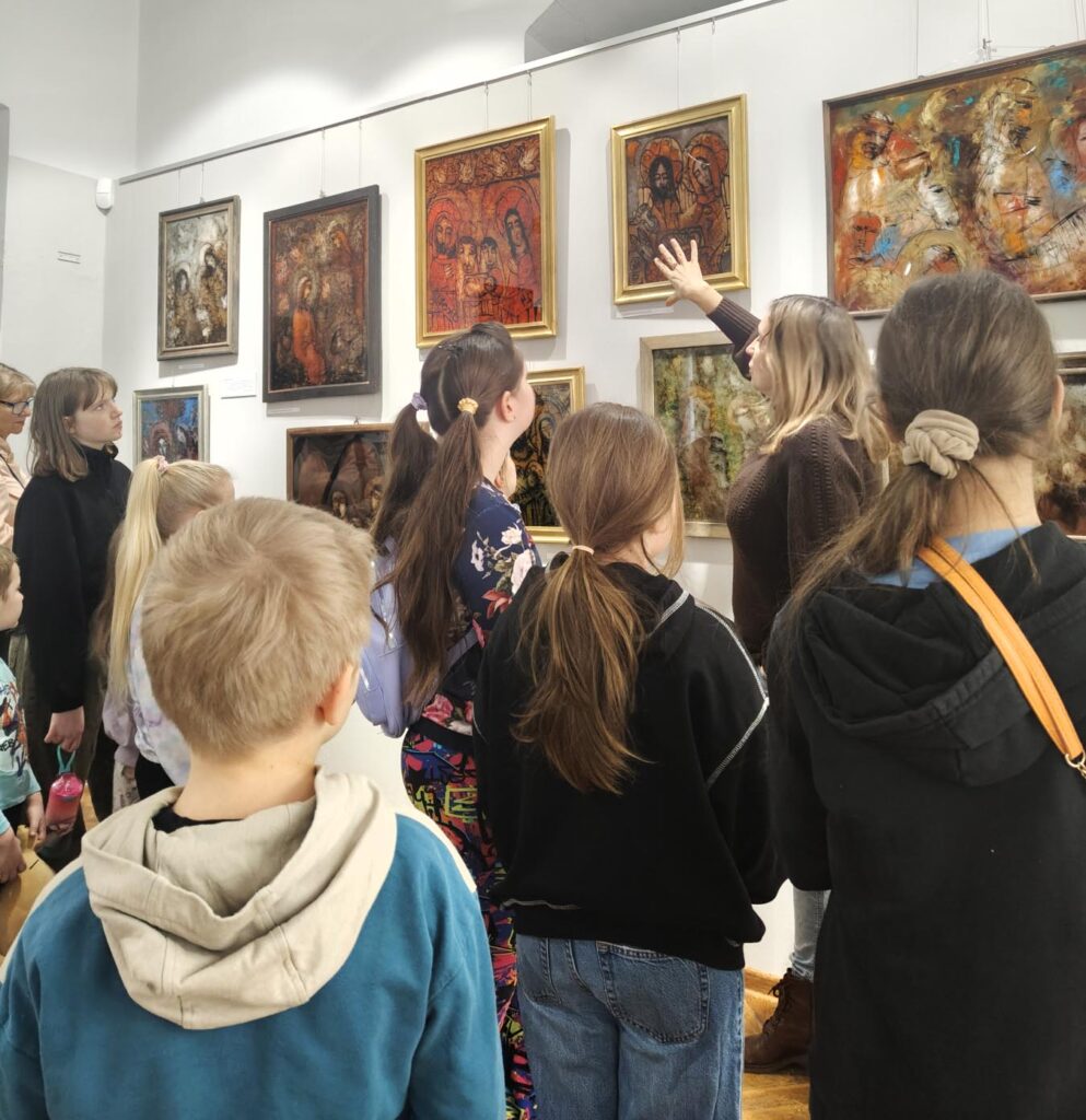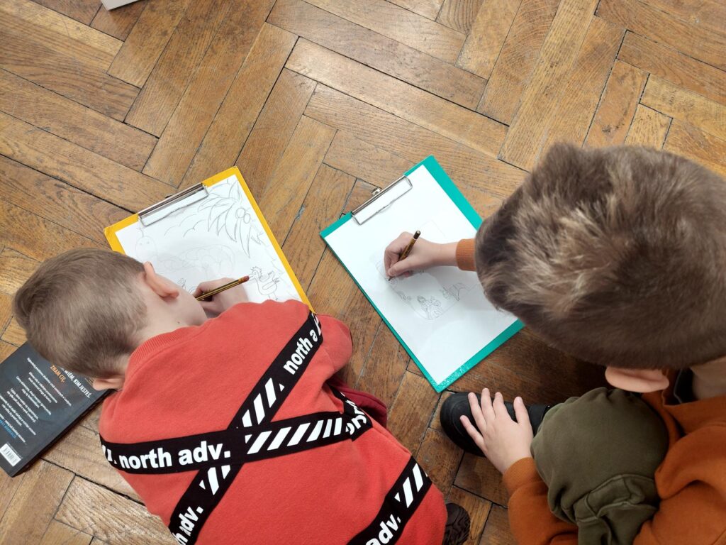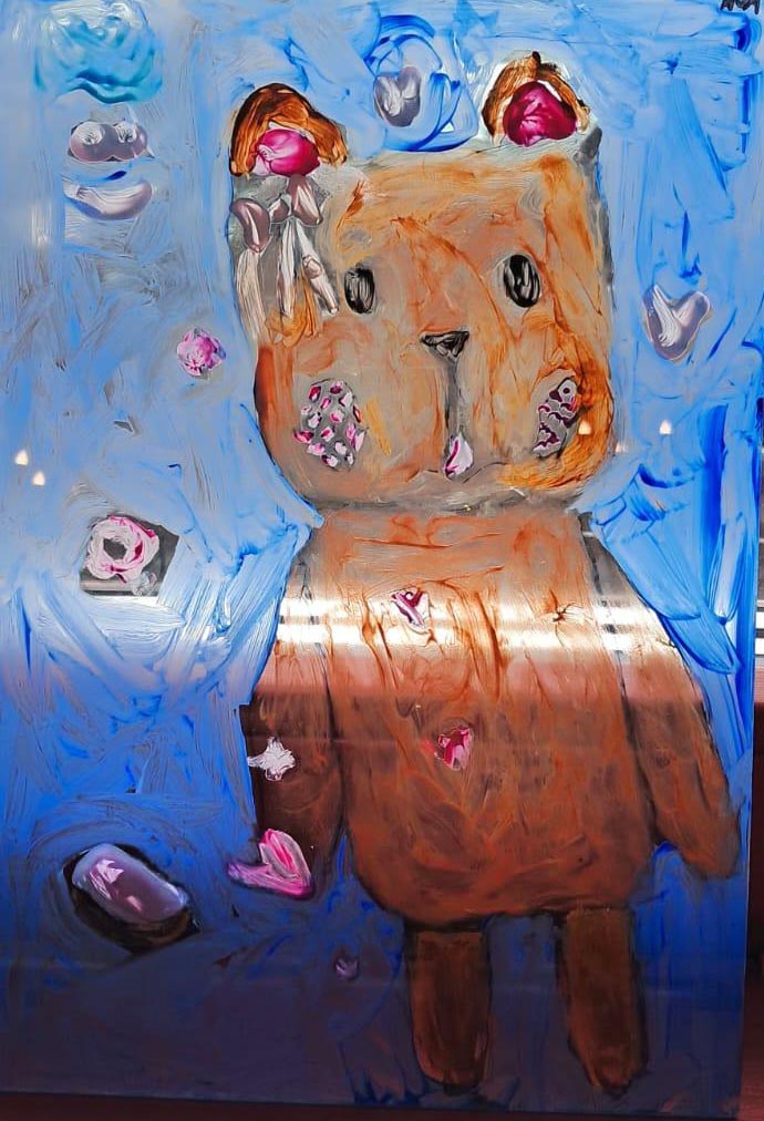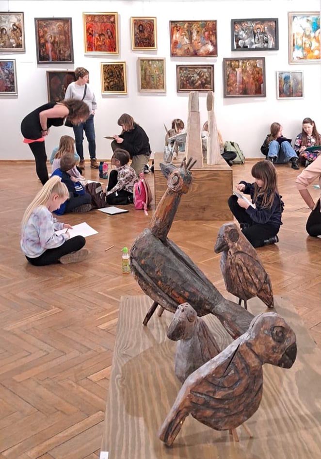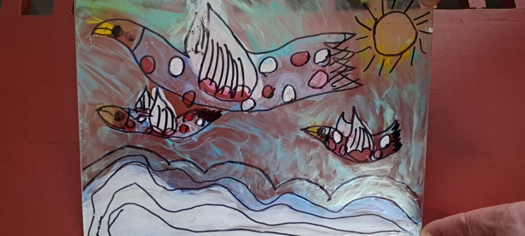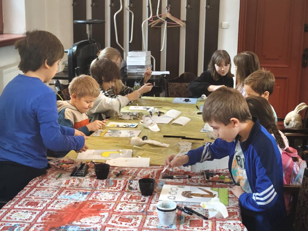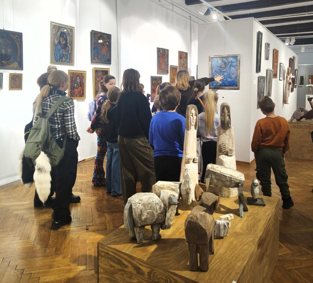 Uczestnicy zajęć poznali twórczość krakowskiego artysty Krzysztofa Okonia na wystawie „Ptaki Niebieskie” i wykonali szkice inspirowane widzianymi obrazami. Następnie zeszliśmy do sali warsztatowej, gdzie, za pomocą pisaków i cienkopisów, dzieci przenosiły na szklaną taflę swoje rysunki, tak jak robił to Artysta. Później, używając farb akrylowych, wypełniały prace wybranymi kolorami.