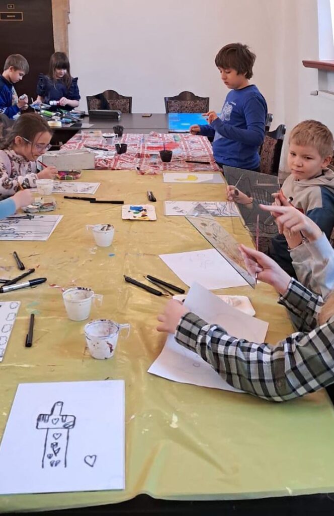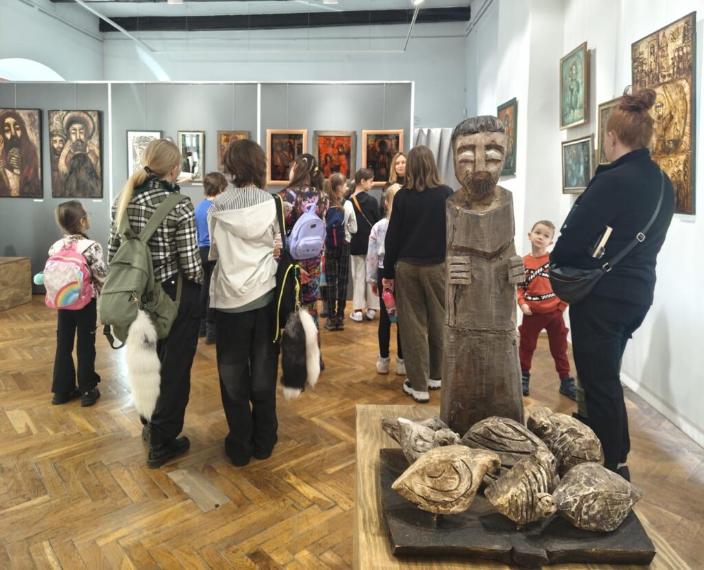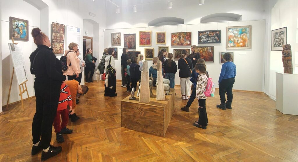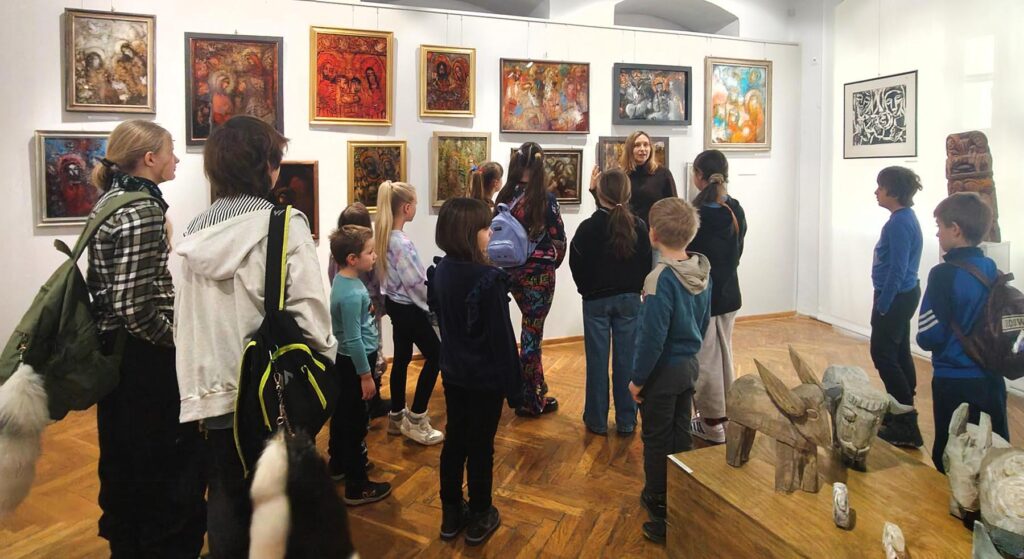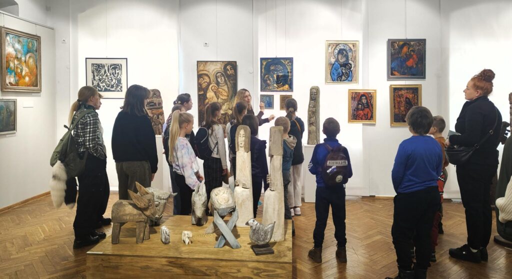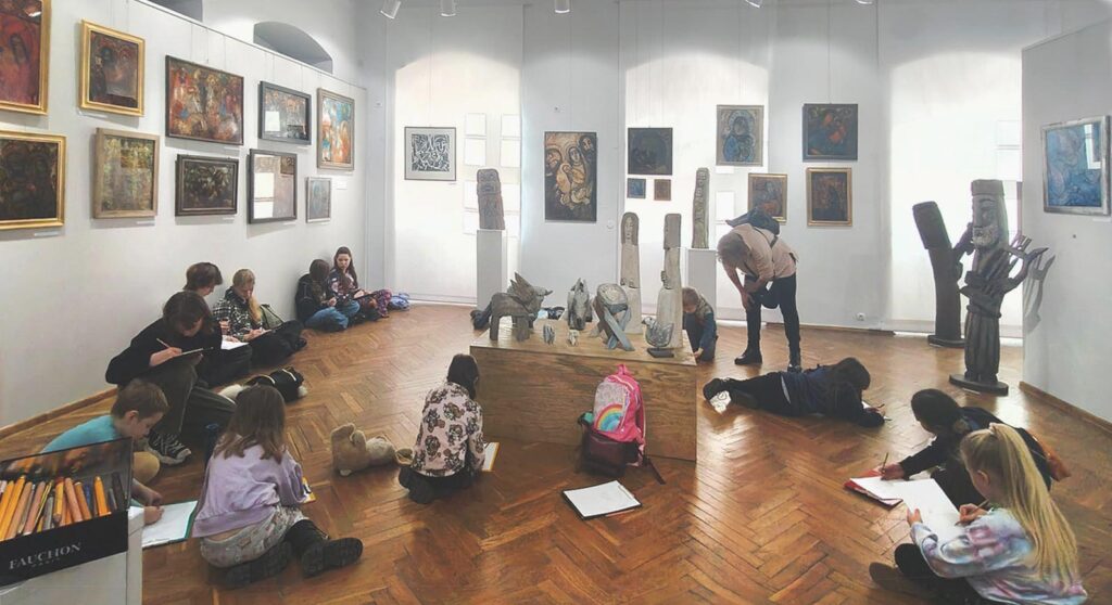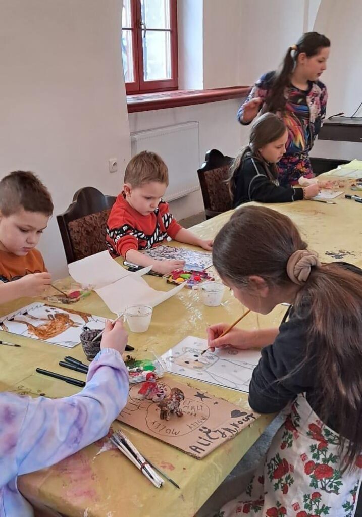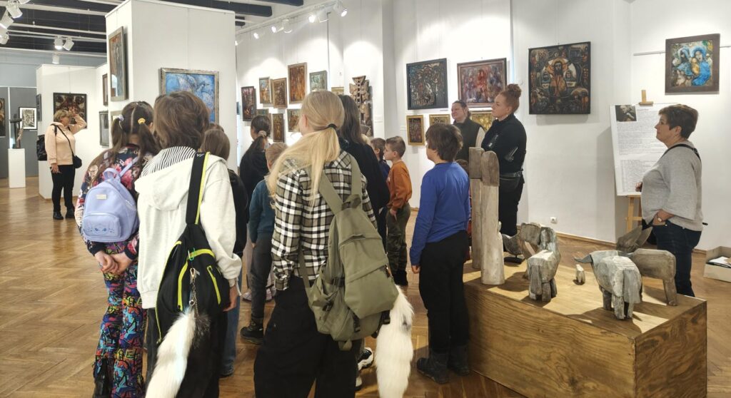 Uczestnicy zajęć poznali twórczość krakowskiego artysty Krzysztofa Okonia na wystawie „Ptaki Niebieskie” i wykonali szkice inspirowane widzianymi obrazami. Następnie zeszliśmy do sali warsztatowej, gdzie, za pomocą pisaków i cienkopisów, dzieci przenosiły na szklaną taflę swoje rysunki, tak jak robił to Artysta. Później, używając farb akrylowych, wypełniały prace wybranymi kolorami.