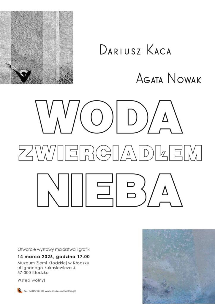 Ekspozycja pod tytułem Woda Zwierciadłem Nieba przedstawia fragment dorobku dwojga współczesnych Artystów, wielokrotnie nagradzanych i prezentujących swą twórczość na wielu wystawach indywidualnych i zbiorowych w Polsce i za granicą, przenikające się techniki twórcze, kolory, kontrasty, pociągnięcia pędzla, kreski i linearność.